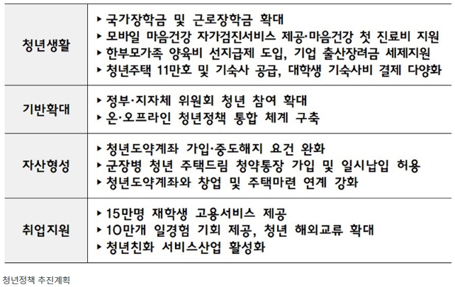 특히 청년들에게 청년정책을 더 쉽게 전달하기 위해 온·오프라인에서 청년정책 통합 전달체계를 구축한다. 온라인에는 통합플랫폼을 구축해 부처별·지역별로 산재된 청년정책 정보를 실시간·맞춤형으로 제공할 계획이다.
