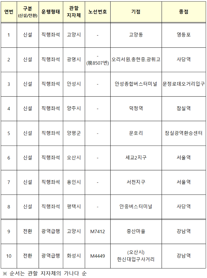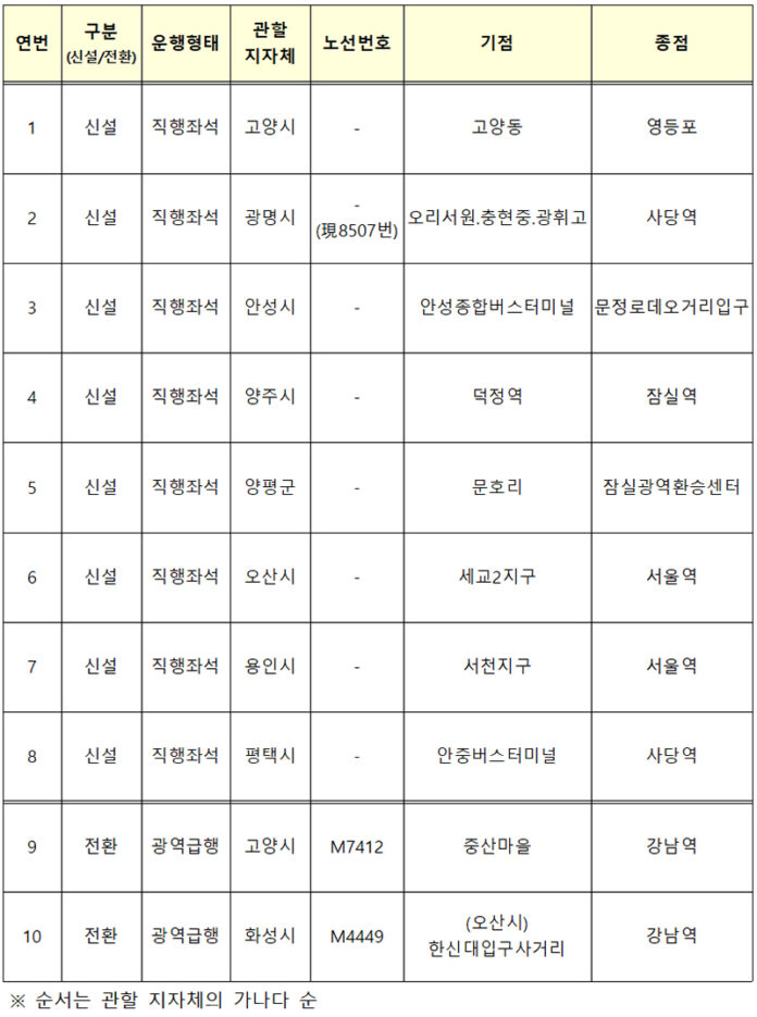 신설 노선은 고양, 광명, 안성, 양주, 양평, 오산, 용인, 평택에서 서울역, 사당역, 영등포, 잠실 등으로 향하는 8개 노선이다.