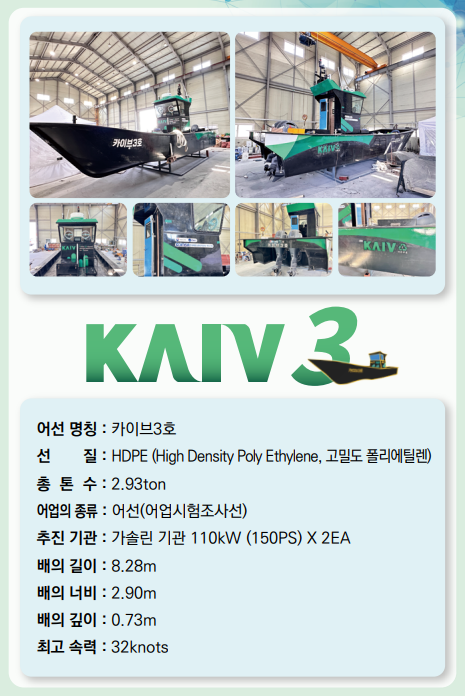 이번에 사용된 HDPE 소재는 건조 시 분진이나 악취의 우려가 없고, 부식이 없어 미세플라스틱이 발생하지 않으며, 재활용이 가능해 친환경 소재로 분류된다. 2010년경부터 노르웨이 등 주요 국가에서는 HDPE를 이용해 선박을 건조하고 있으며, ‘카이브3호’는 해양수산부가 추진해 온 AI기반 어선안전 설계데이터플랫폼 개발 및 실증 연구개발(R&D) 사업의 성과로서 우리나라 최초의 HDPE 소재 어선이다.